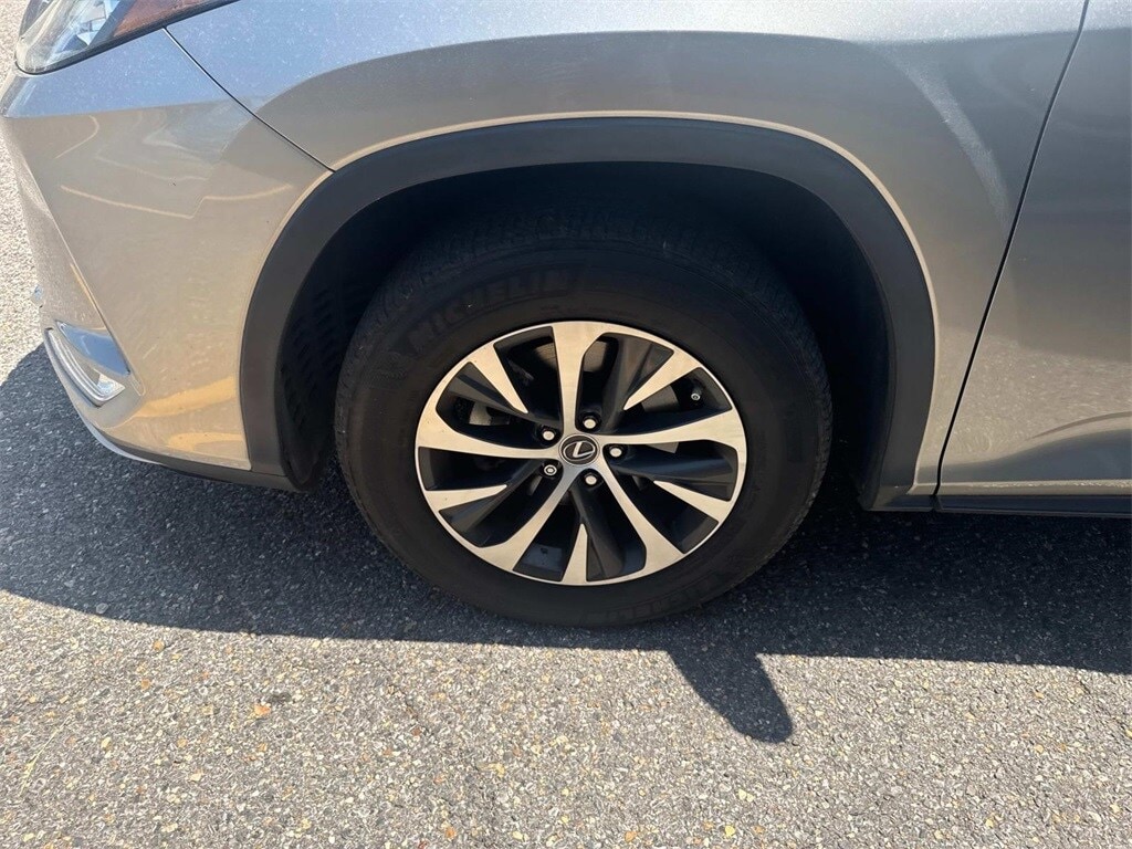 Gray This RX 350 is nicely equipped with 18" x 8" Aluminum Wheels, 3.33 Axle Ratio, 4-Wheel Disc Brakes, 9 Speakers, ABS brakes, Air Conditioning, Alloy wheels, AM/FM radio: SiriusXM, AM/FM/CD Radio, Anti-whiplash front head restraints, Apple CarPlay/Android Auto, Auto High-beam Headlights, Auto-dimming door mirrors, Auto-dimming Rear-View mirror, Automatic temperature control, Brake assist, Bumpers: body-color, CD player, Compass, Delay-off headlights, Driver door bin, Driver vanity mirror, Dual front impact airbags, Dual front side impact airbags, Electronic Stability Control, Emergency communication system, Exterior Parking Camera Rear, Four wheel independent suspension, Front anti-roll bar, Front Bucket Seats, Front Center Armrest, Front dual zone A/C, Front reading lights, Fully automatic headlights, Garage door transmitter: HomeLink, Genuine wood console insert, Genuine wood door panel insert, Heated door mirrors, Illuminated entry, Knee airbag, Leather Shift Knob, Low tire pressure warning, NuLuxe Seat Trim, Occupant sensing airbag, Outside temperature display, Overhead airbag, Overhead console, Panic alarm, Passenger door bin, Passenger vanity mirror, Power door mirrors, Power driver seat, Power Liftgate, Power passenger seat, Power steering, Power windows, Radio data system, Rain sensing wipers, Rear anti-roll bar, Rear reading lights, Rear seat center armrest, Rear side impact airbag, Rear window defroster, Rear window wiper, Remote keyless entry, Security system, Speed control, Speed-sensing steering, Split folding rear seat, Spoiler, Steering wheel mounted audio controls, Tachometer, Telescoping steering wheel, Tilt steering wheel, Traction control, Trip computer, Turn signal indicator mirrors, and Variably intermittent wipers.